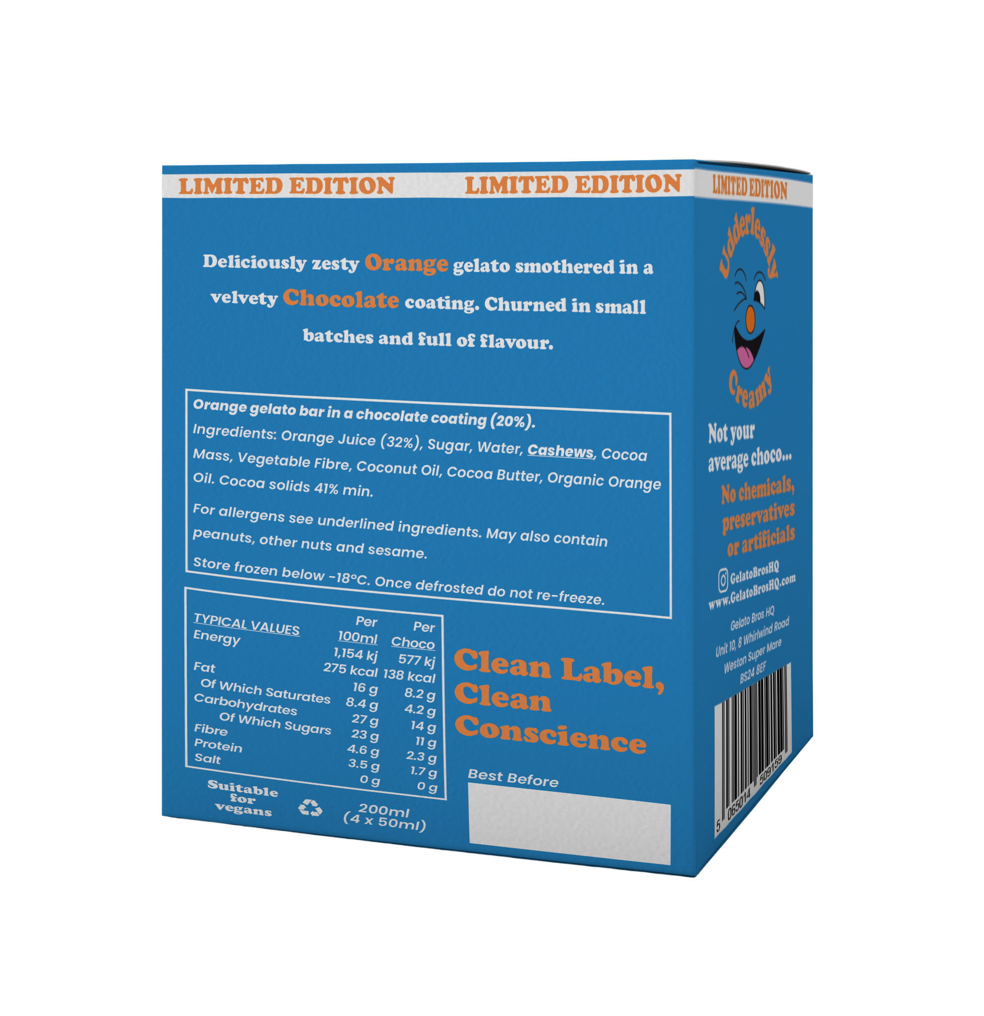 Deliciously zesty orange gelato smothered in a velvety chocolate coating.