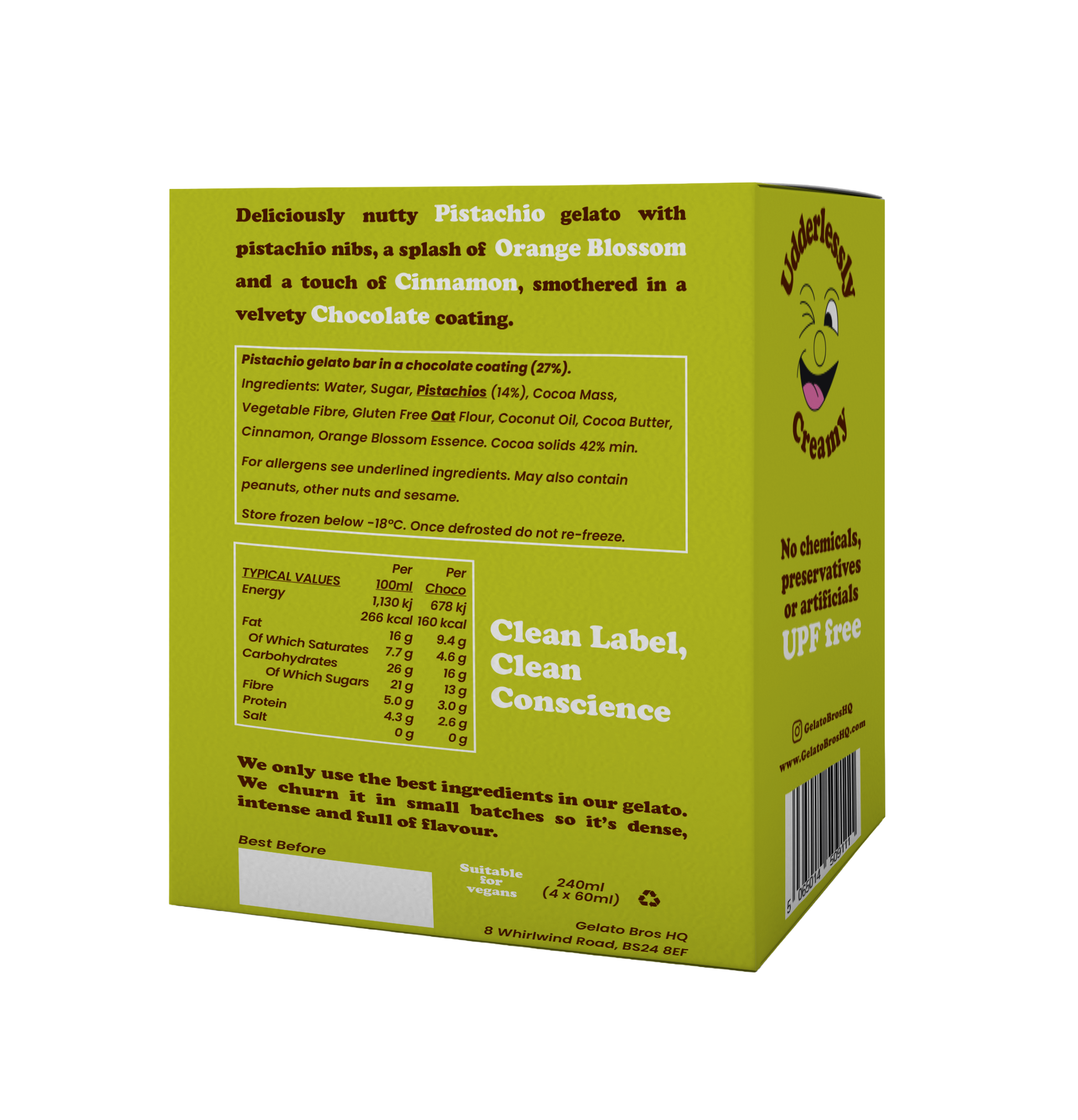Pistachio Baklawa: Deliciously nutty pistachio gelato with pistachio nibs, a splash of orange blossom and a touch of cinnamon, smothered in a velvety chocolate coating.