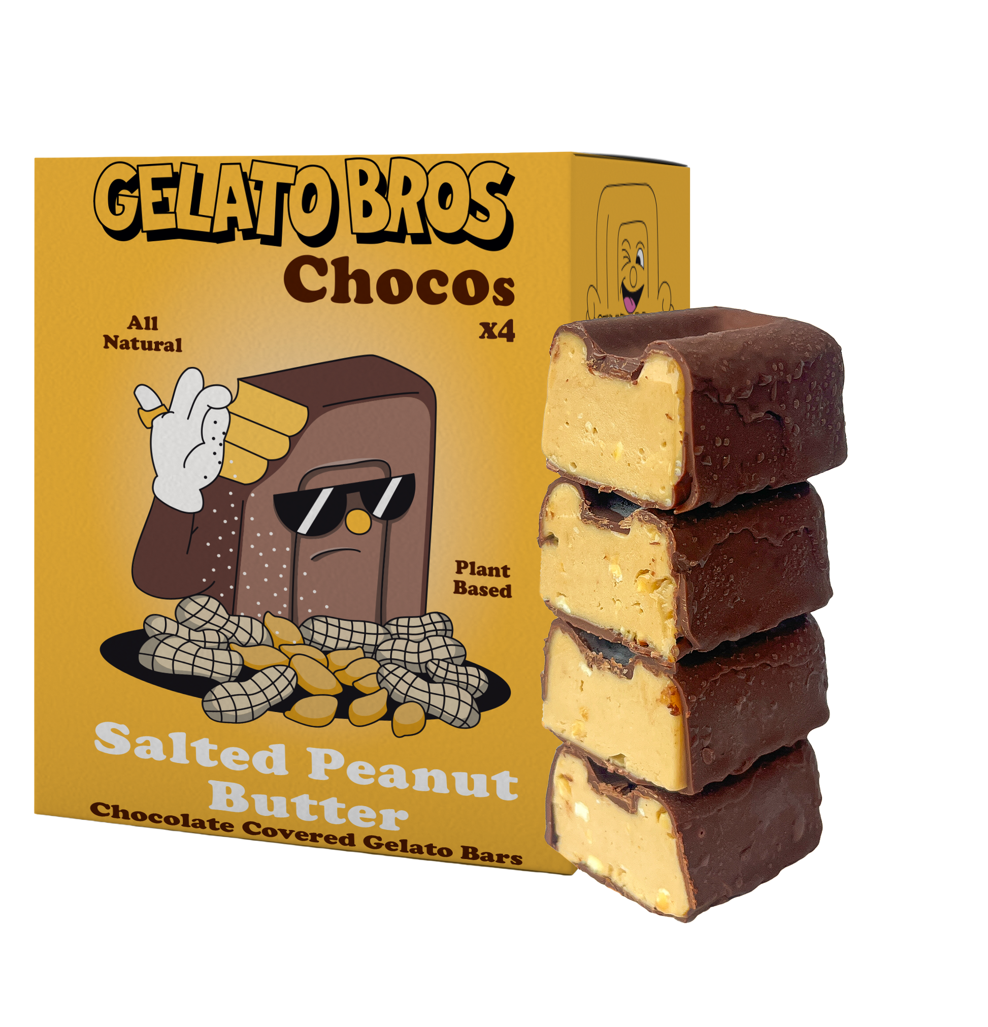 Dark roast peanut butter gelato with peanut nibs and a sprinkle of sea salt, smothered in a velvety chocolate coating.
